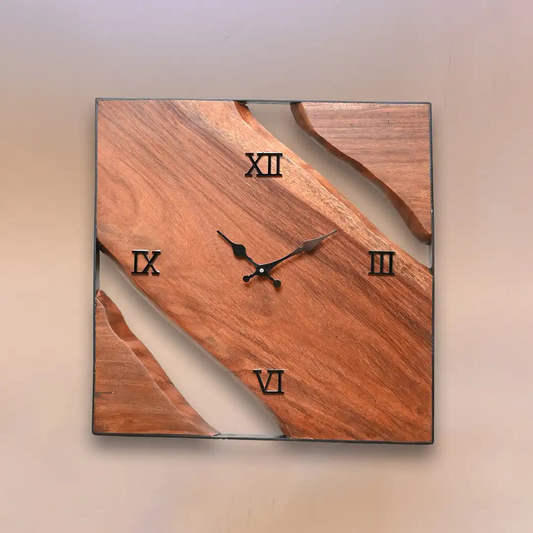 The Haze Live Edge Clock blends natural charm with modern elegance. Crafted from Sheesham wood, its square shape showcases the unique live edges, making each clock a distinctive piece of art. The rich grain and smooth finish add warmth and sophistication, enhancing any interior space.