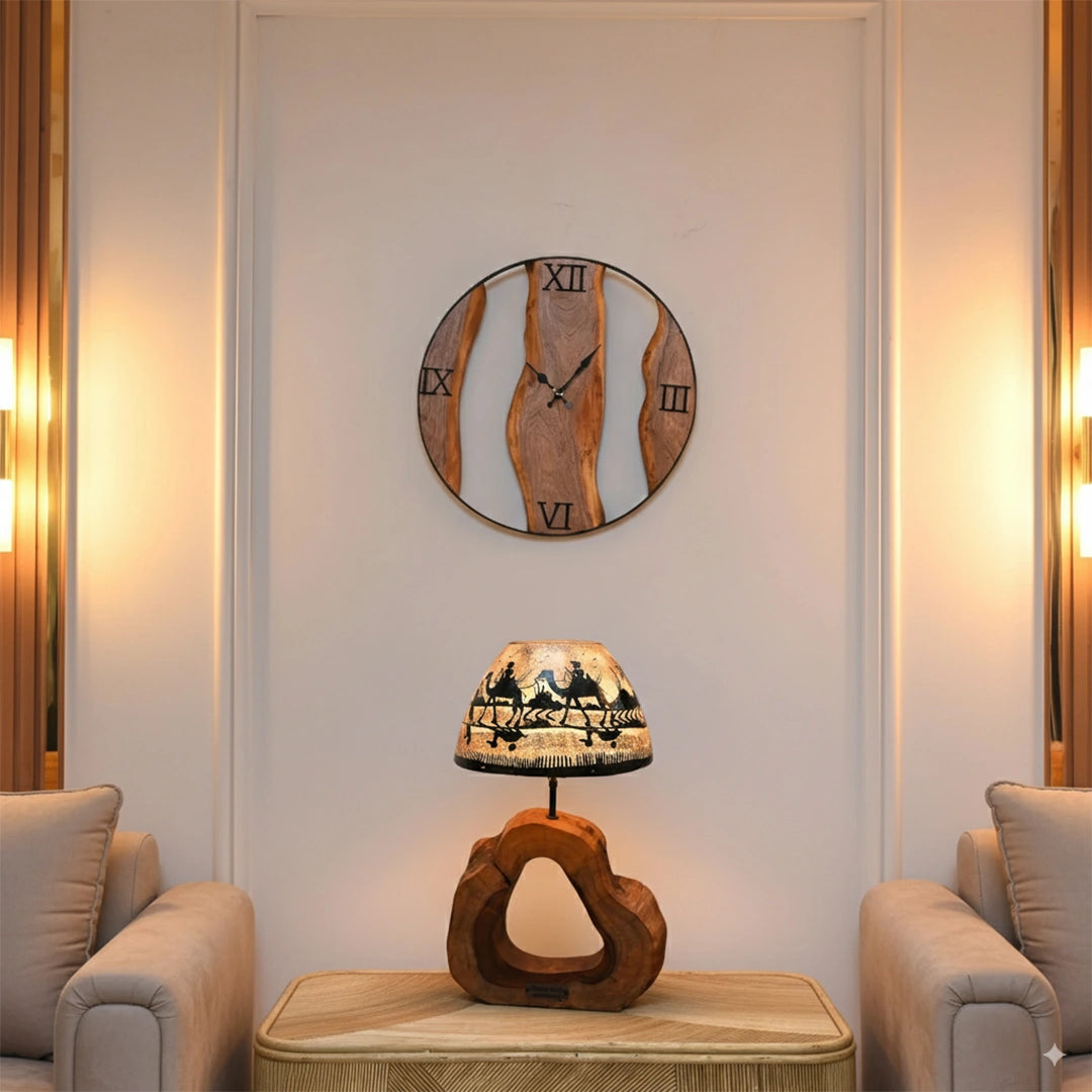 Celebrate heritage, time, and timeless craftsmanship with this exclusive bundle featuring the Noor-e-Multan Live Edge Lamp and the Zaman Live Edge Clock. Handcrafted from solid Sheesham wood, this duo blends rich tradition with natural elegance. The Noor-e-Multan Lamp features a beautifully detailed camel skin lampshade, a tribute to the cultural artistry of Multan. Its soft, ambient glow brings warmth and soul to any space, while the live edge wooden base adds organic texture and character. Complementing it is the Zaman Live Edge Clock, a striking wall piece that showcases the flowing grain and raw beauty of Sheesham wood. With its minimalist clock face and natural contours, it’s a perfect balance of form, function, and timeless design. Together, these pieces create an atmosphere that honors tradition while embracing the beauty of nature and contemporary style. Includes: Noor-e-Multan Live Edge Lamp (13" x 15") Zaman Live Edge Clock (16" x 16") Material: Solid Sheesham Wood A meaningful fusion of culture and craftsmanship — this set is more than décor; it’s a story told in light and time. 🕰️✨