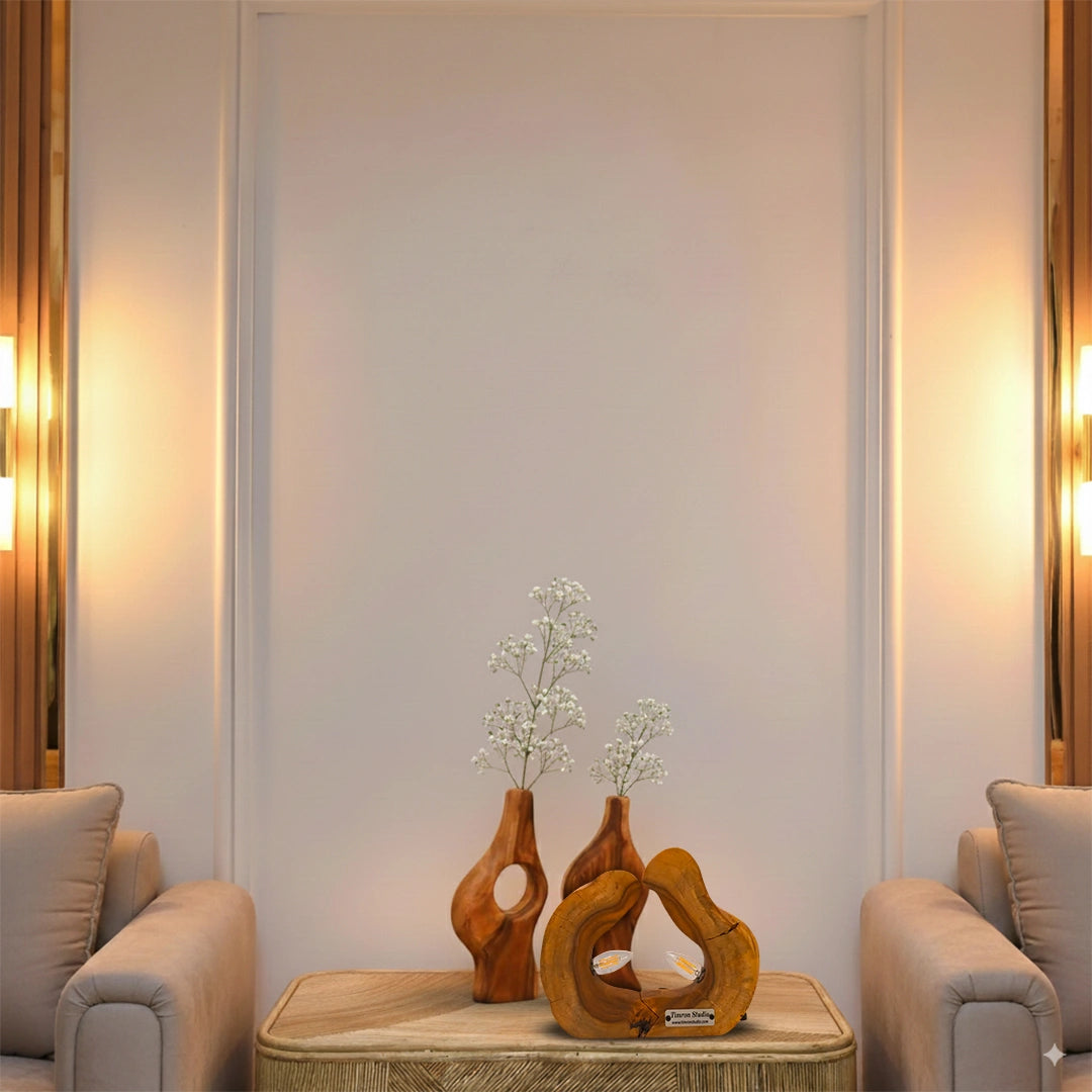 Celebrate the beauty of nature and connection with this exclusive bundle featuring the Twin Flame Live Edge Lamp and the Willow Duo Live Edge Vase. Expertly handcrafted from solid Sheesham wood, this set showcases the natural artistry of live edge design — highlighting rich textures, organic grain patterns, and the raw elegance of the material. The Twin Flame Live Edge Lamp is a striking symbol of harmony and duality. With two sculpted, mirror-like forms and exposed bulbs, it offers a warm, ambient glow that transforms any room into a cozy, inviting space. Paired perfectly with the Willow Duo Live Edge Vase, which features dual openings for graceful floral arrangements, this bundle blends function with artistry. The vase’s sophisticated silhouette and natural edges make it an ideal centerpiece for both rustic and modern interiors. Whether styled together or displayed separately, these pieces bring timeless character, craftsmanship, and natural warmth to your space. Includes: Twin Flame Live Edge Lamp (Set of 2 sculptural bases with exposed bulbs) Willow Duo Live Edge Vase Material: Solid Sheesham Wood