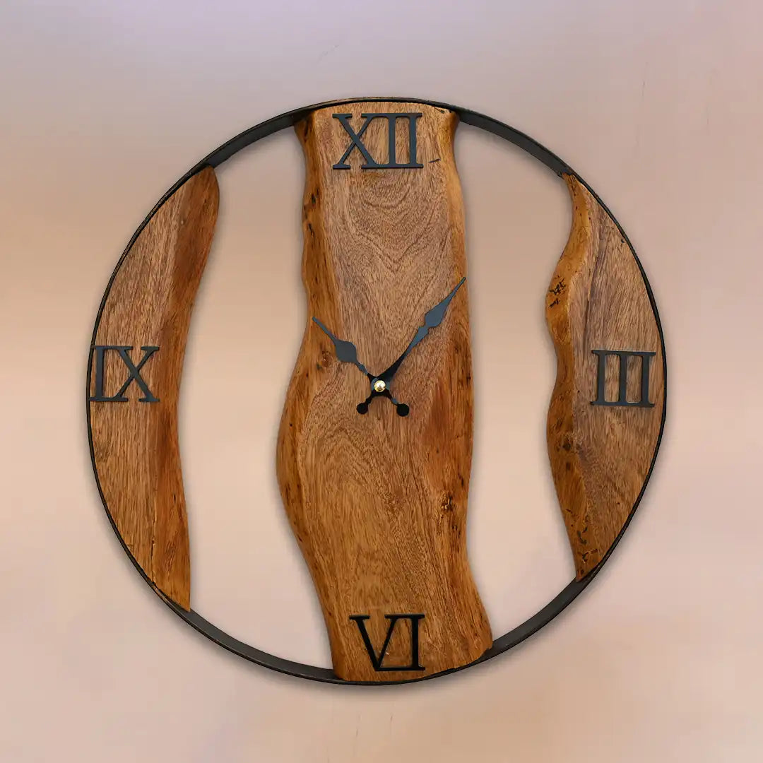 The Zaman Live Edge Clock showcases the perfect harmony between nature and craftsmanship. Crafted from Neem wood, its circular shape embraces the raw beauty of live edges, making each piece truly one of a kind. The distinctive grain patterns and smooth finish bring warmth and character to any space.